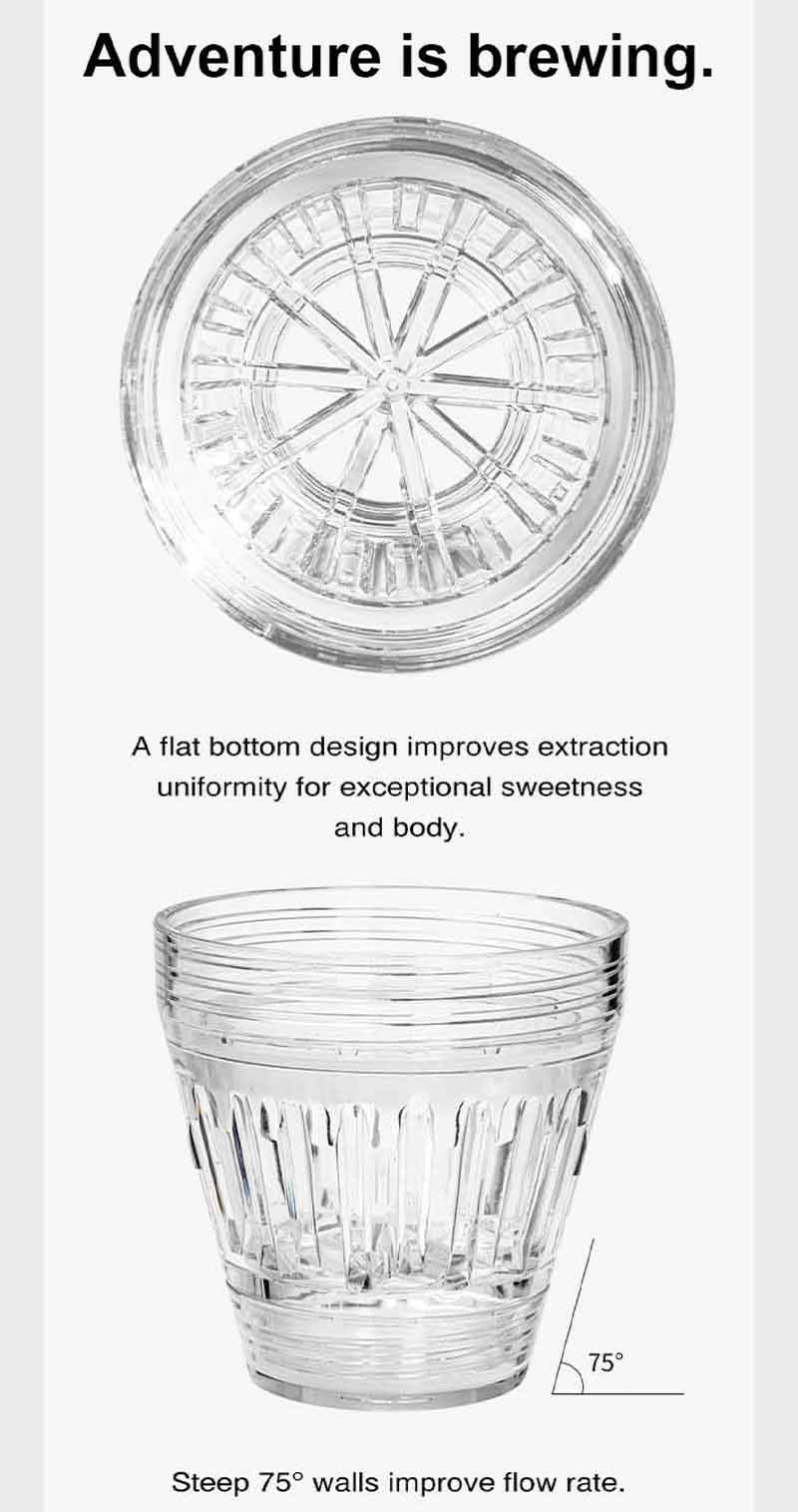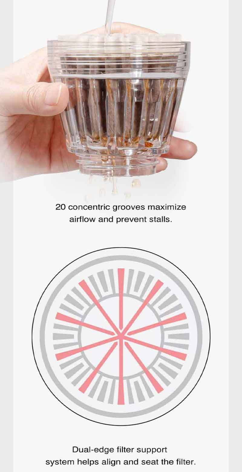 The Timemore Ice Eye Travel Cup features a 75° filter cup wall angle and 20 internal concave water flow channels, which work together to optimize the brewing process. These design elements allow for an even distribution of water and a faster, more efficient extraction. As the hot water flows through the grounds, it ensures that all the coffee flavors are released in harmony, creating a rich and aromatic cup of coffee with every brew. The design also ensures that water flows evenly and consistently, enhancing the flavor and aroma with every pour.
