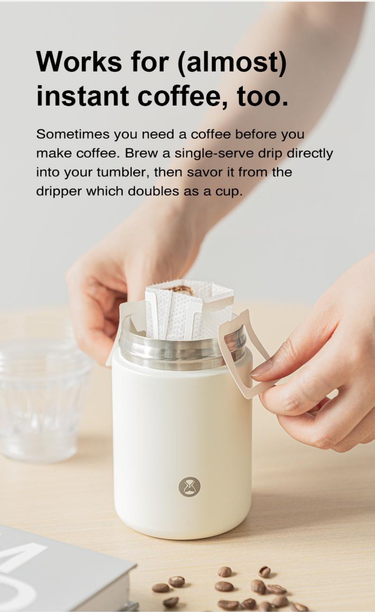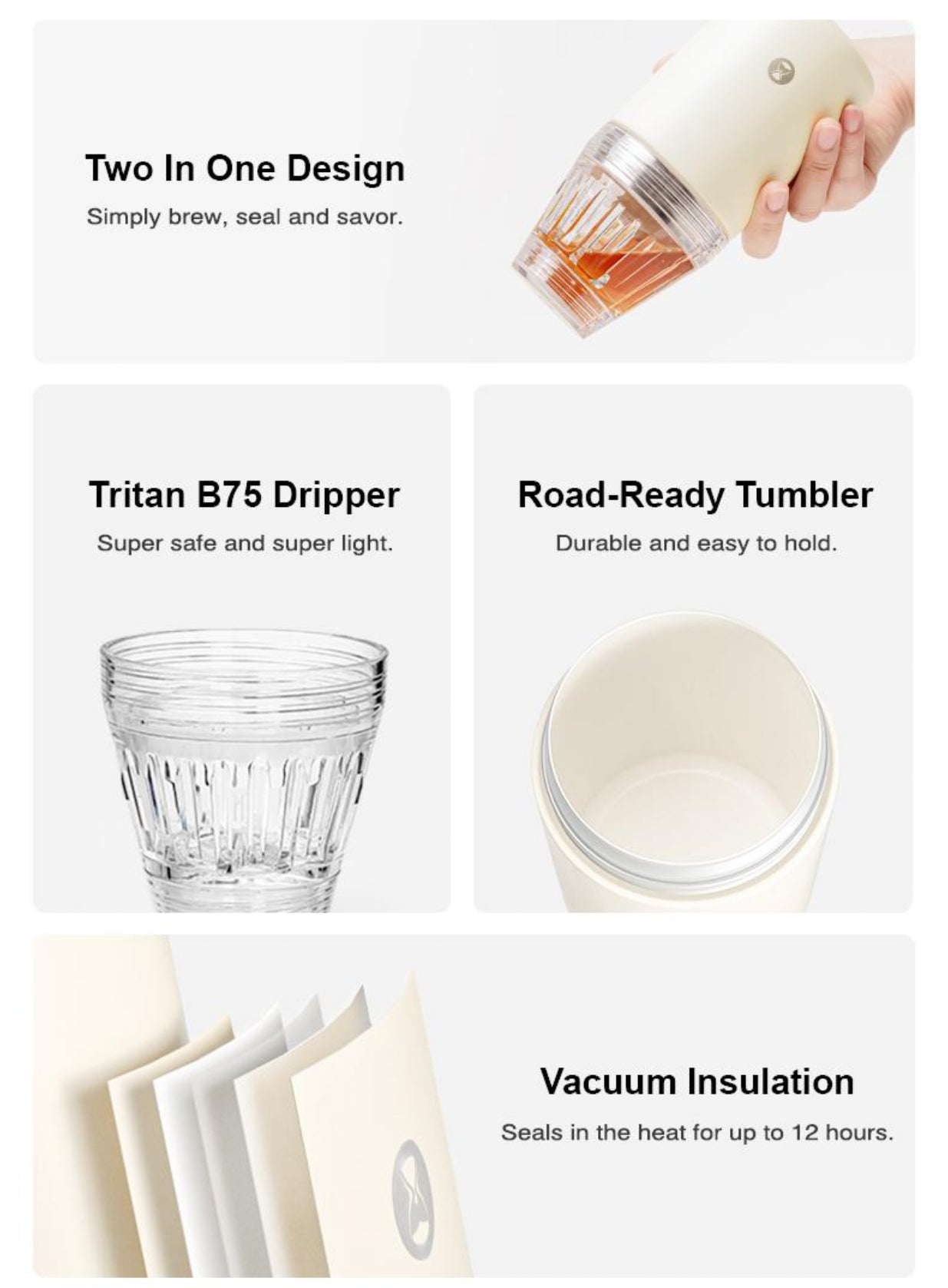 Wherever you are, if there’s hot water, there’s a cup of coffee waiting for you. The 2-in-1 lid design allows you to quickly and easily brew pour-over coffee. With no need for electrical equipment, just pour hot water over the grounds, and you'll have freshly brewed coffee in no time. Whether you’re hiking in the mountains, enjoying a camping trip, or simply at the office, you can have professional-quality coffee anywhere you go. The Timemore Ice Eye Travel Cup allows you to enjoy a great coffee experience without the need for bulky brewing devices or complicated setups.