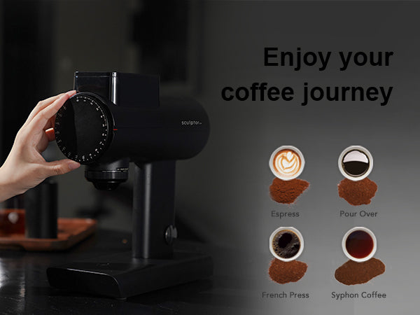 The TIMEMORE Sculptor 064 electric coffee grinder features patented flat burrs, stepless grind adjustment, and a quiet brushless motor with PID control. Designed for espresso, pour-over, and French press, it includes adjustable RPM, a rotary knocker for easy cleaning, and magnetic alignment for a clean, precise grinding workflow.